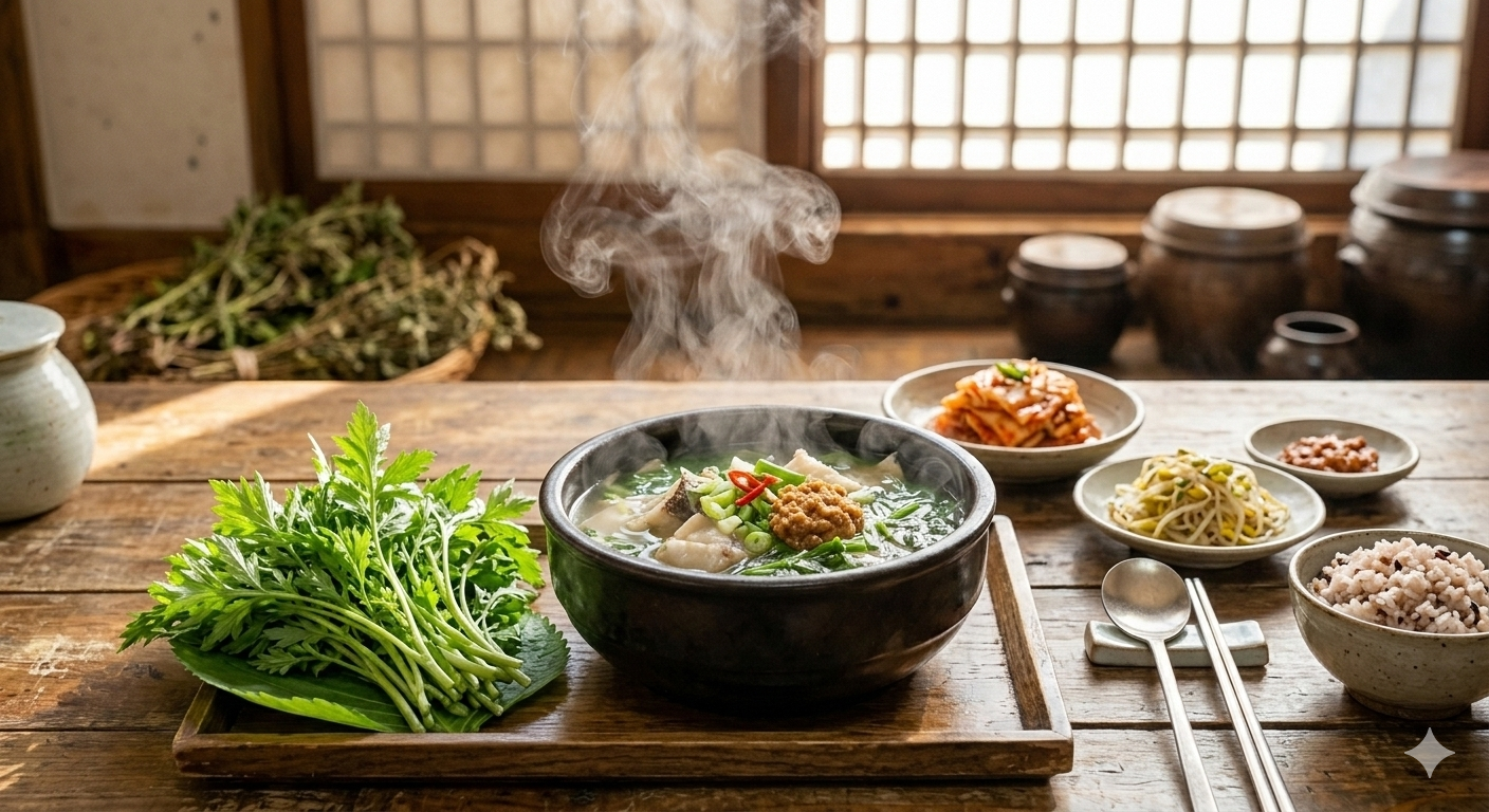 (음주 다음 날 쑥국이 좋은 이유죠!) - 위장 건강 증진: 섬유질이 풍부해 변비를 예방하고, 위 점막을 보호해 소화가 잘 안 되는 분들에게 추천합니다.